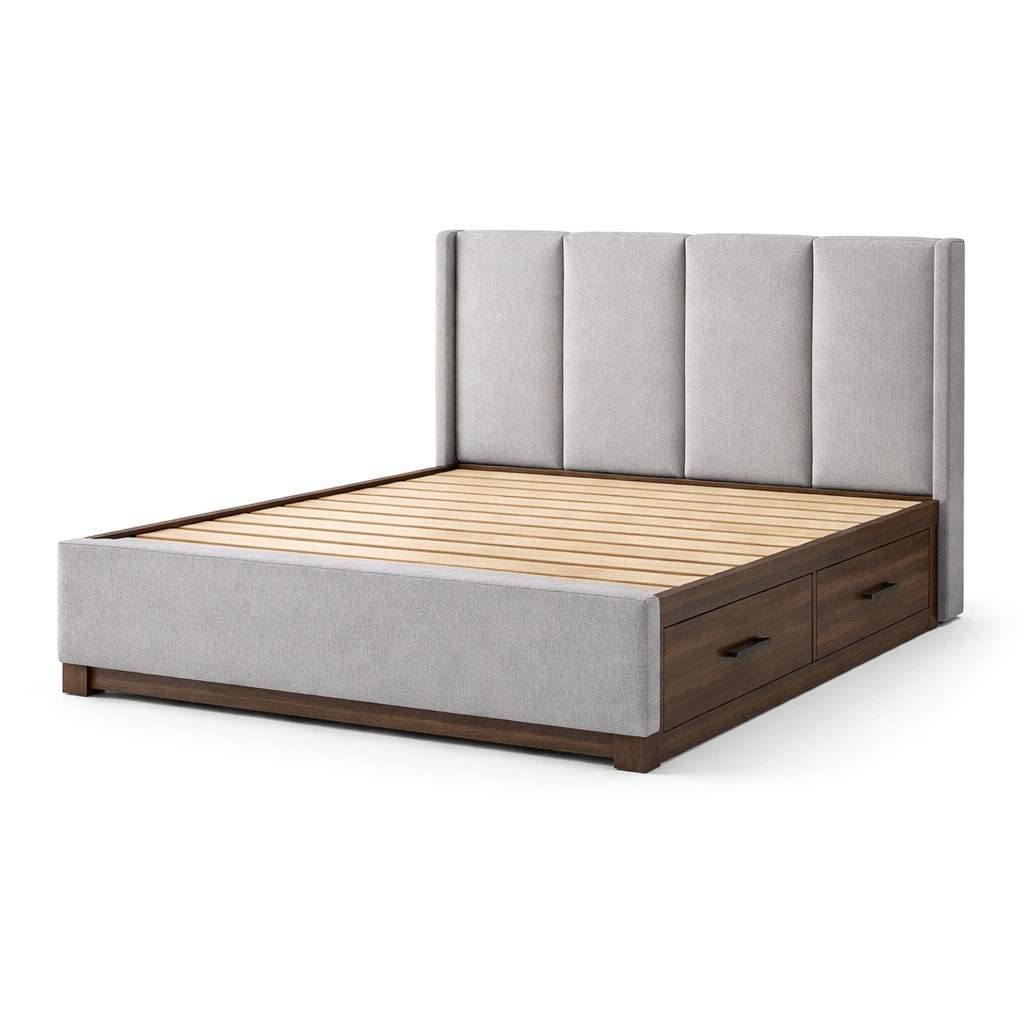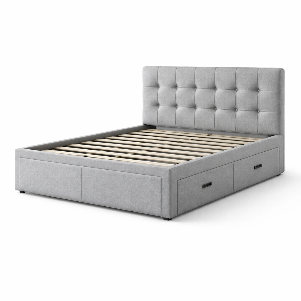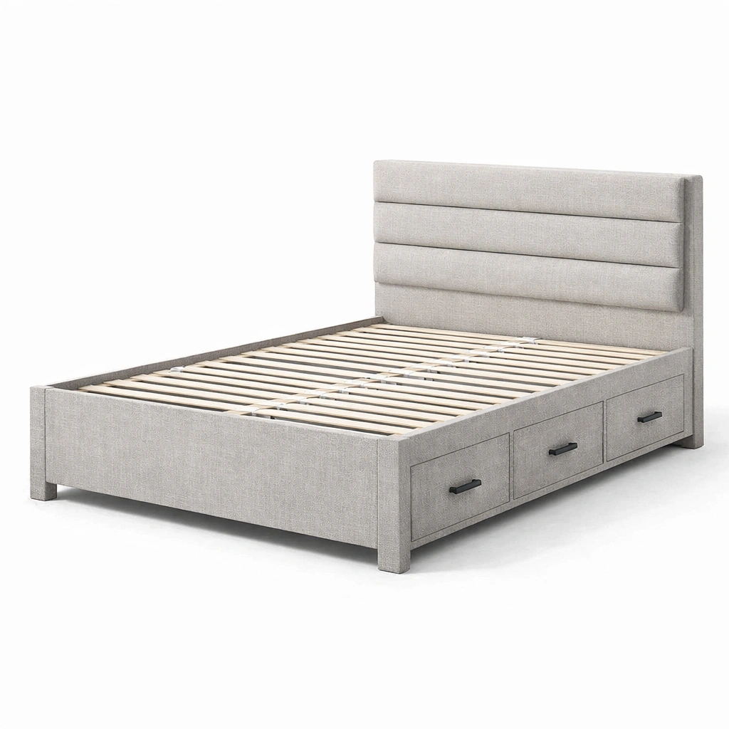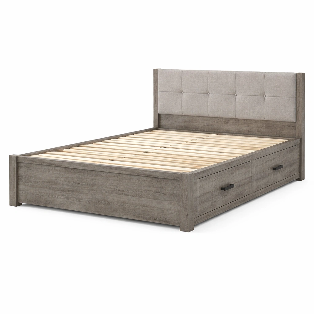 Bett mit stauraum aus holz und stoff grau mit schubladen