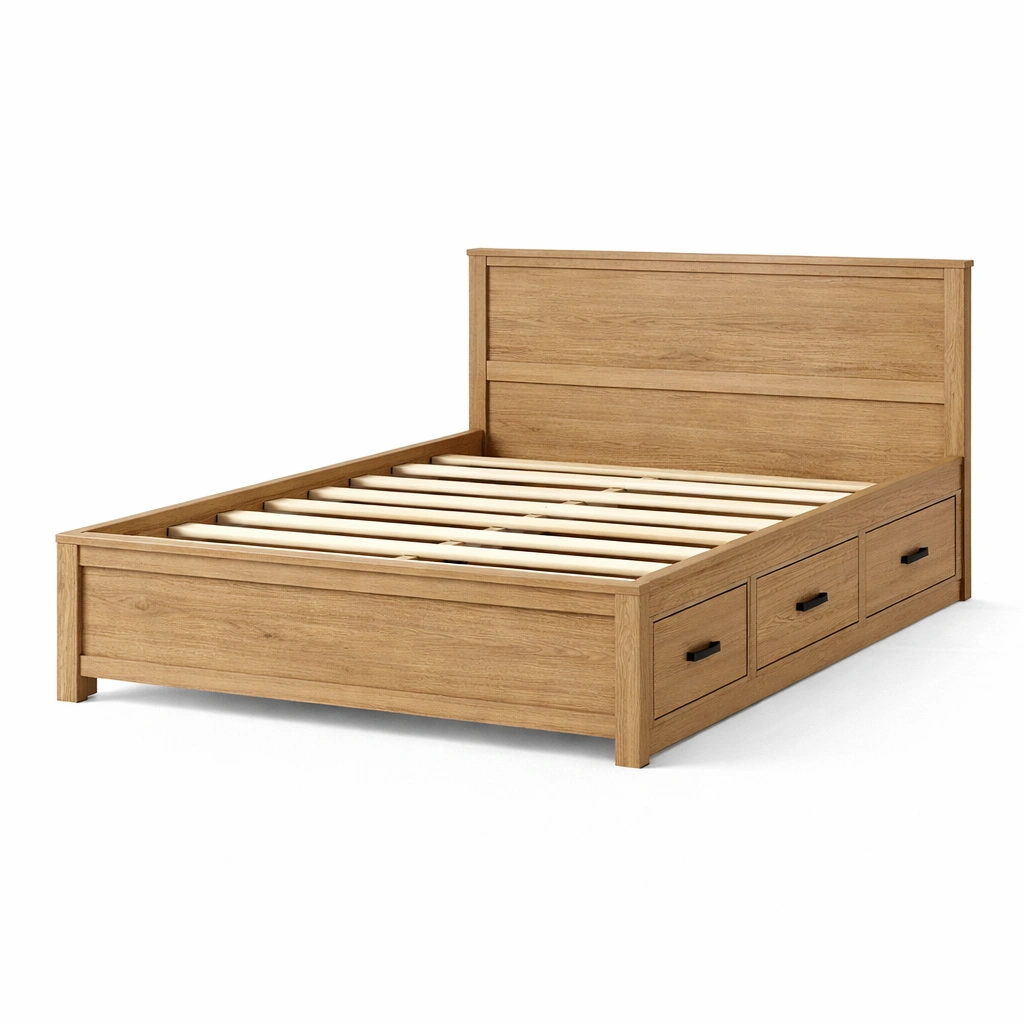 Bett mit stauraum aus eichenholz mit schubladen und metallgriffen