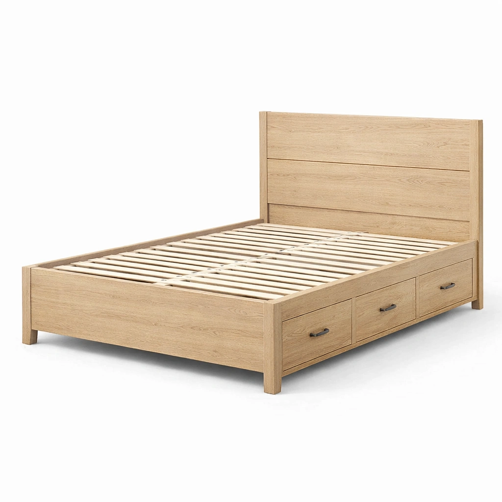 Bett mit stauraum aus eichenholz mit schubladen und metallgriffen