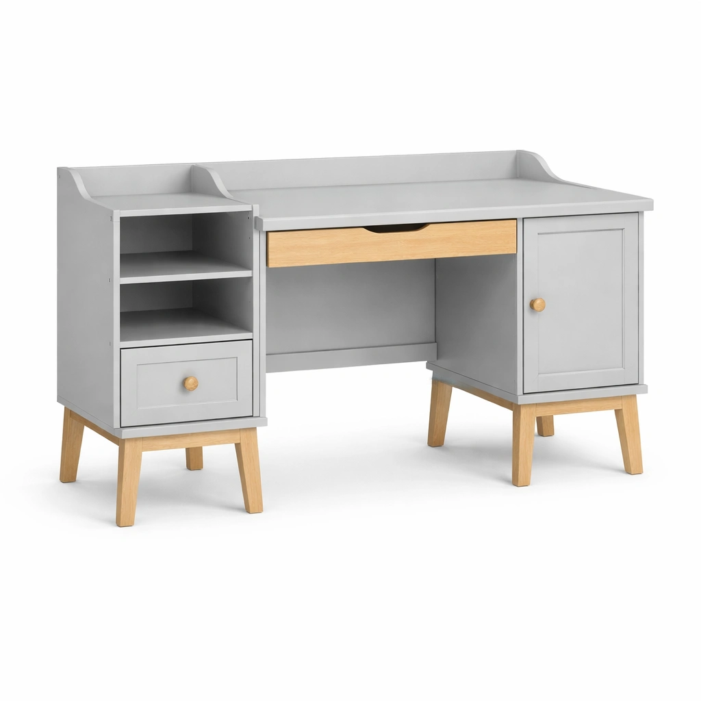 Schreibtisch aus mdf grau mit massivholzbeinen