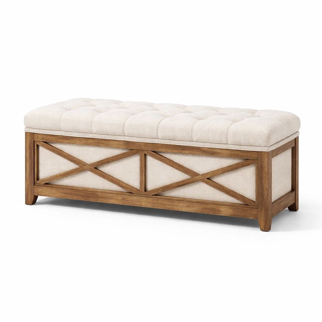 Diese Bank besteht aus einem robusten Rahmen aus Massivholz und einer Polsterung aus Leinenstoff. Sie bietet unter der Sitzfläche zusätzlichen Stauraum und hat eine rechteckige Form. Die gepolsterte Sitzfläche sorgt für Bequemlichkeit.